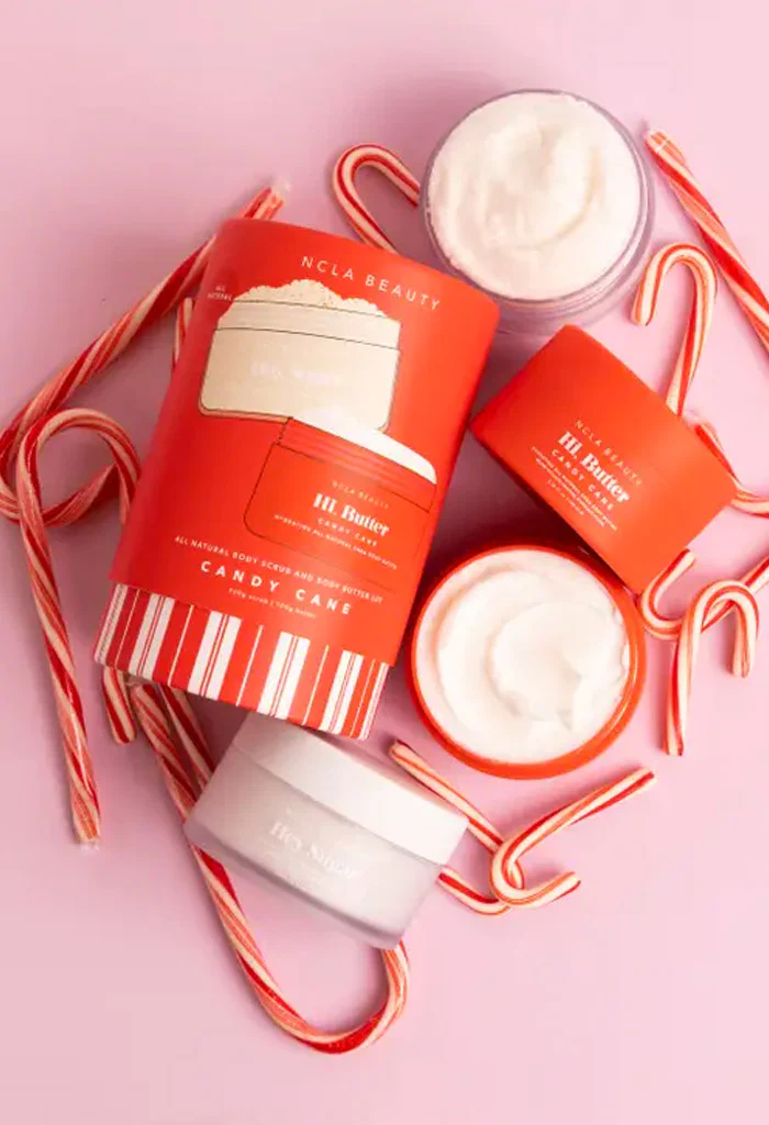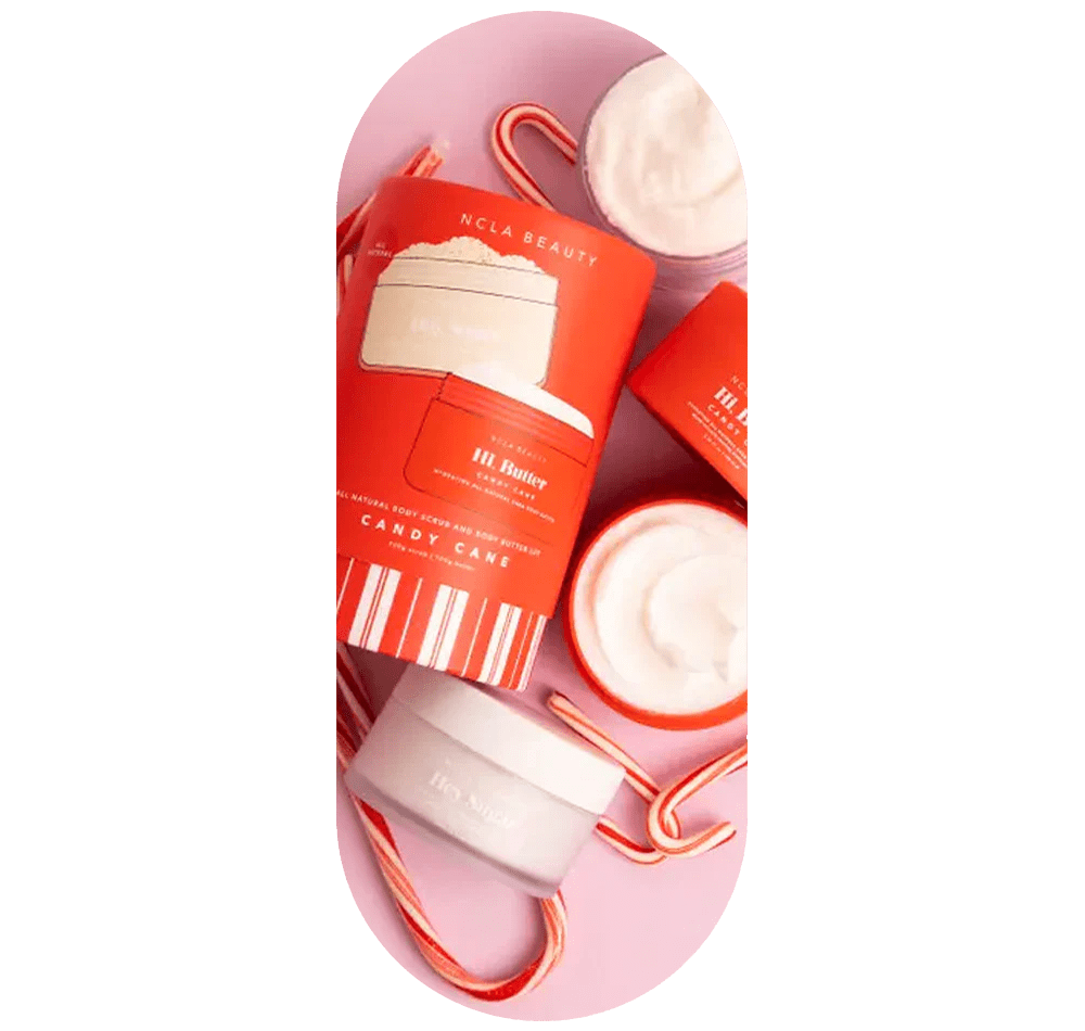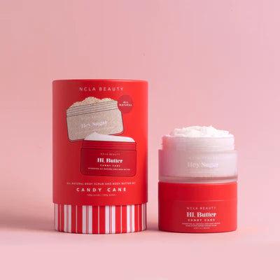 This body scrub and body butter sets contains a 100 ml size Hey, Sugar Candy Cane body scrub and a 100 ml size Hi, Butter Candy Cane body butter.